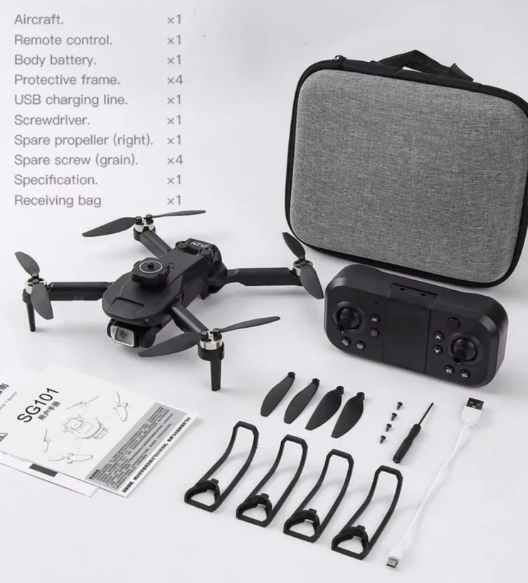 بدنه این کوادکوپتر از متریال باکیفیت ساخته شده و همزمان سبک و مقاوم است. طراحی آیرودینامیک باعث میشود پرواز نرم و پایداری داشته باشید و کنترل آن حتی در شرایط باد ملایم نیز راحت باشد. ظاهر مدرن و جذاب کوادکوپتر SG101 Pro حس حرفهای بودن را به کاربر منتقل میکند.