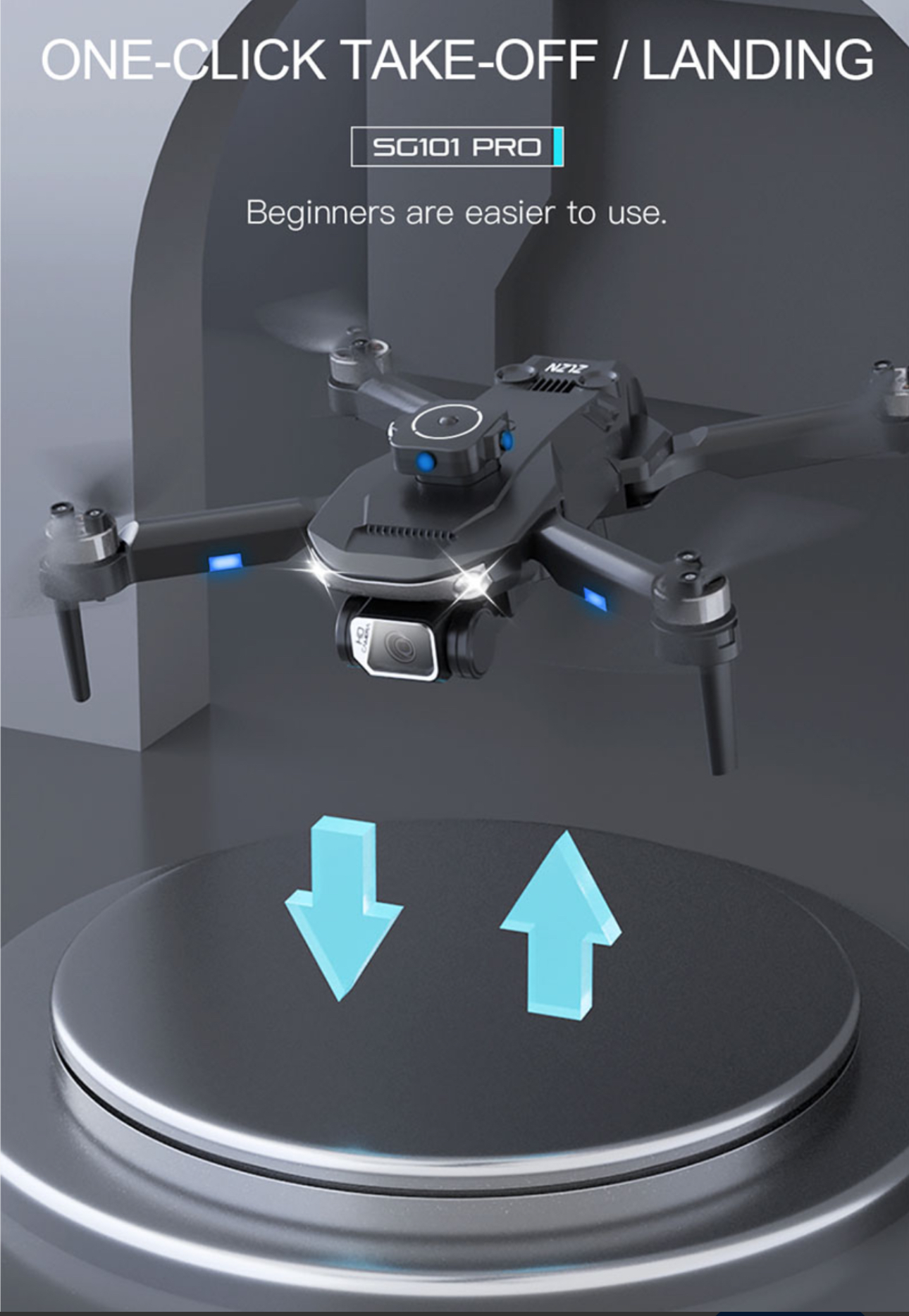 بدنه این کوادکوپتر از متریال باکیفیت ساخته شده و همزمان سبک و مقاوم است. طراحی آیرودینامیک باعث میشود پرواز نرم و پایداری داشته باشید و کنترل آن حتی در شرایط باد ملایم نیز راحت باشد. ظاهر مدرن و جذاب کوادکوپتر SG101 Pro حس حرفهای بودن را به کاربر منتقل میکند.