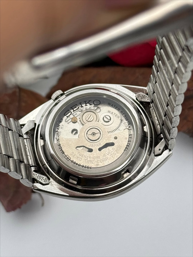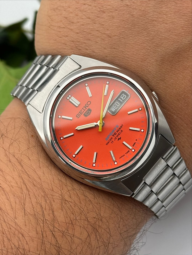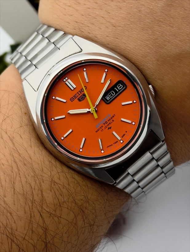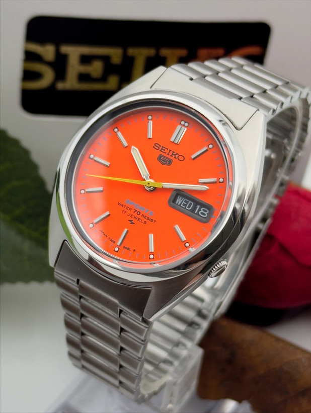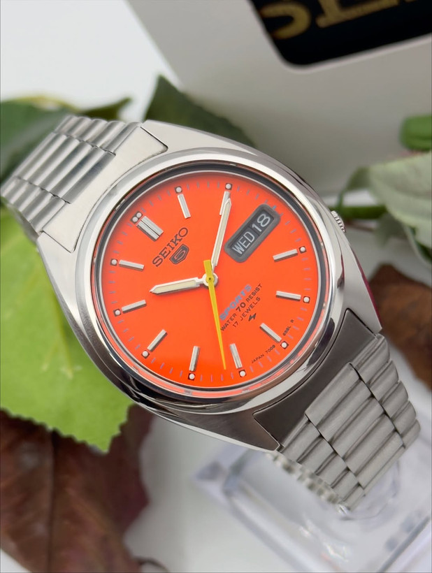 خیلی شیک و زیبا اتوماتیک ساخت ژاپن۲۱سنگ جواهرصفحه نارنجی مشکی کلاسیک مدل خاص و زیباکالبیر7s26پشت شیشه