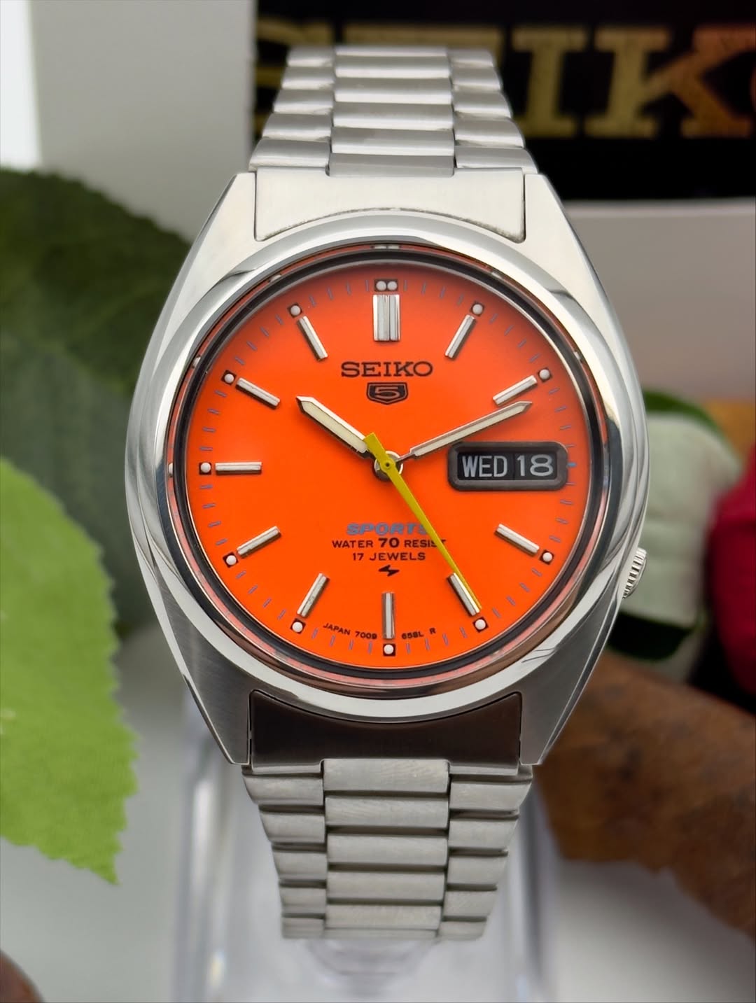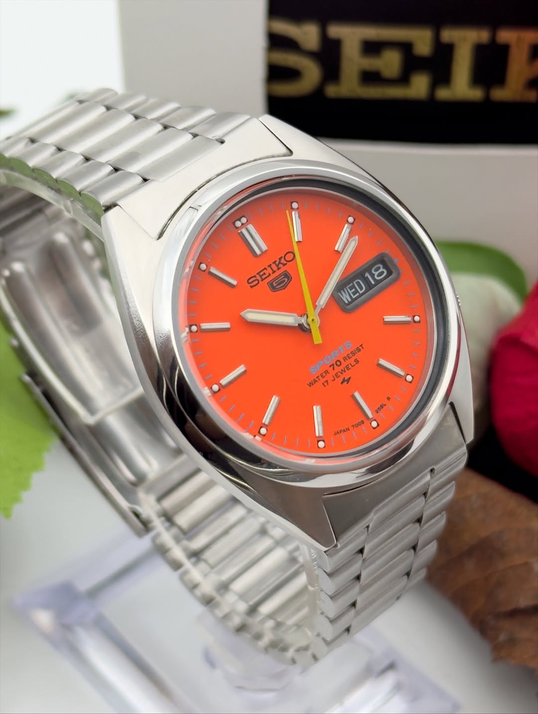 خیلی شیک و زیبا اتوماتیک ساخت ژاپن۲۱سنگ جواهرصفحه نارنجی مشکی کلاسیک مدل خاص و زیباکالبیر7s26پشت شیشه