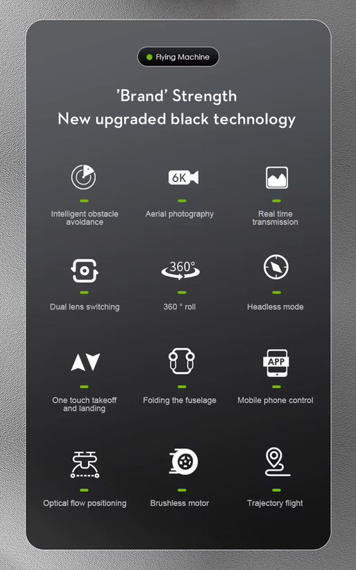 سنسور ویژن ، چرخش دور سوژه ، تعقیب سوژه ، عکس و فیلم گرفتن با نشان دادن دست ، پرواز آسان در شب بخاطر LED های پر نور ، هشدار خارج شدن از برد ، هشدار اتمام باتری ، مسیر دهی ، تنظیم سرعت ، زوم 50x ، تغییر زاویه دوربین با رادیو کنترل