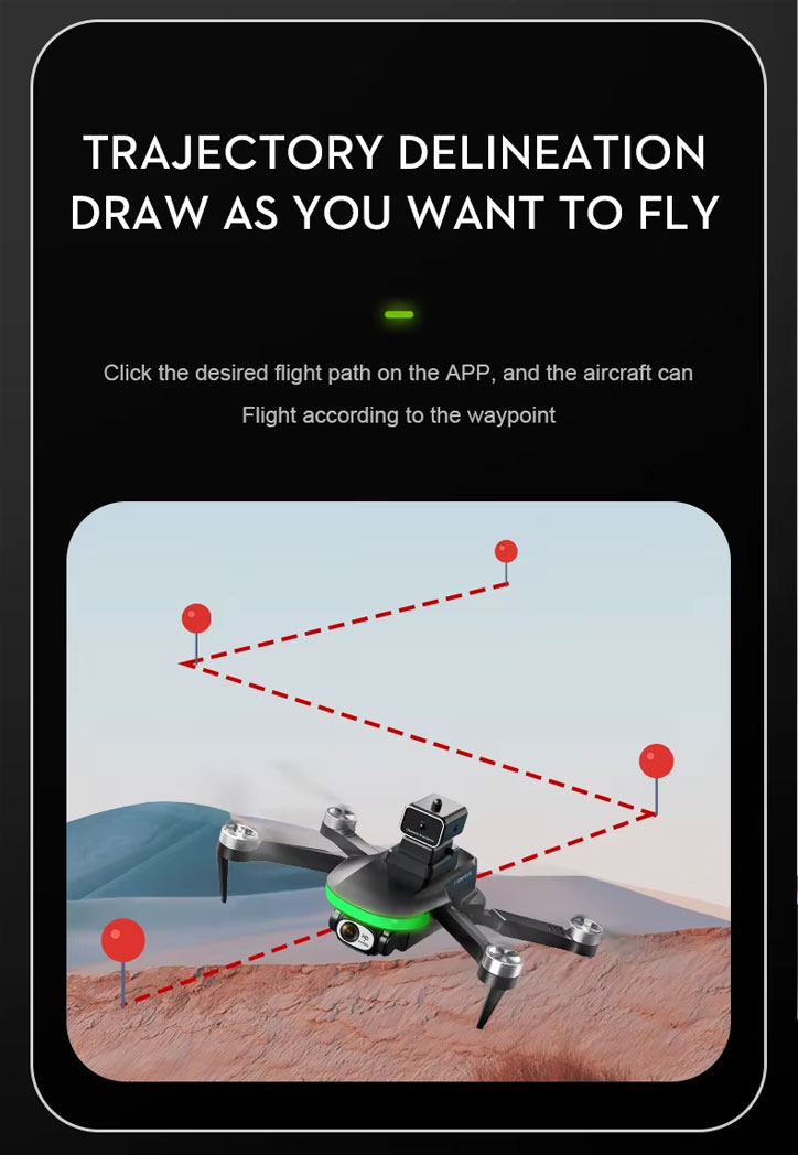 ویژگی پرواز طبق مسیر از پیش تعیین شده یک مود هوشمند پرواز و تصویربرداری است که به شما این امکان را میدهد که با استفاده از اپلیکیشن موبایل، مسیر دلخواه خود را روی صفحه گوشی ترسیم کنید و پس از رسم مسیر، کوادکوپتر S5S Mini به صورت خودکار و بدون نیاز به هدایت دستی، همان خطوط و نقاط مشخص شده را دنبال میکند. این قابلیت برای زمانی که میخواهید تصاویر یا ویدیوهای سینمایی و دقیق ثبت کنید بسیار کاربردی است.