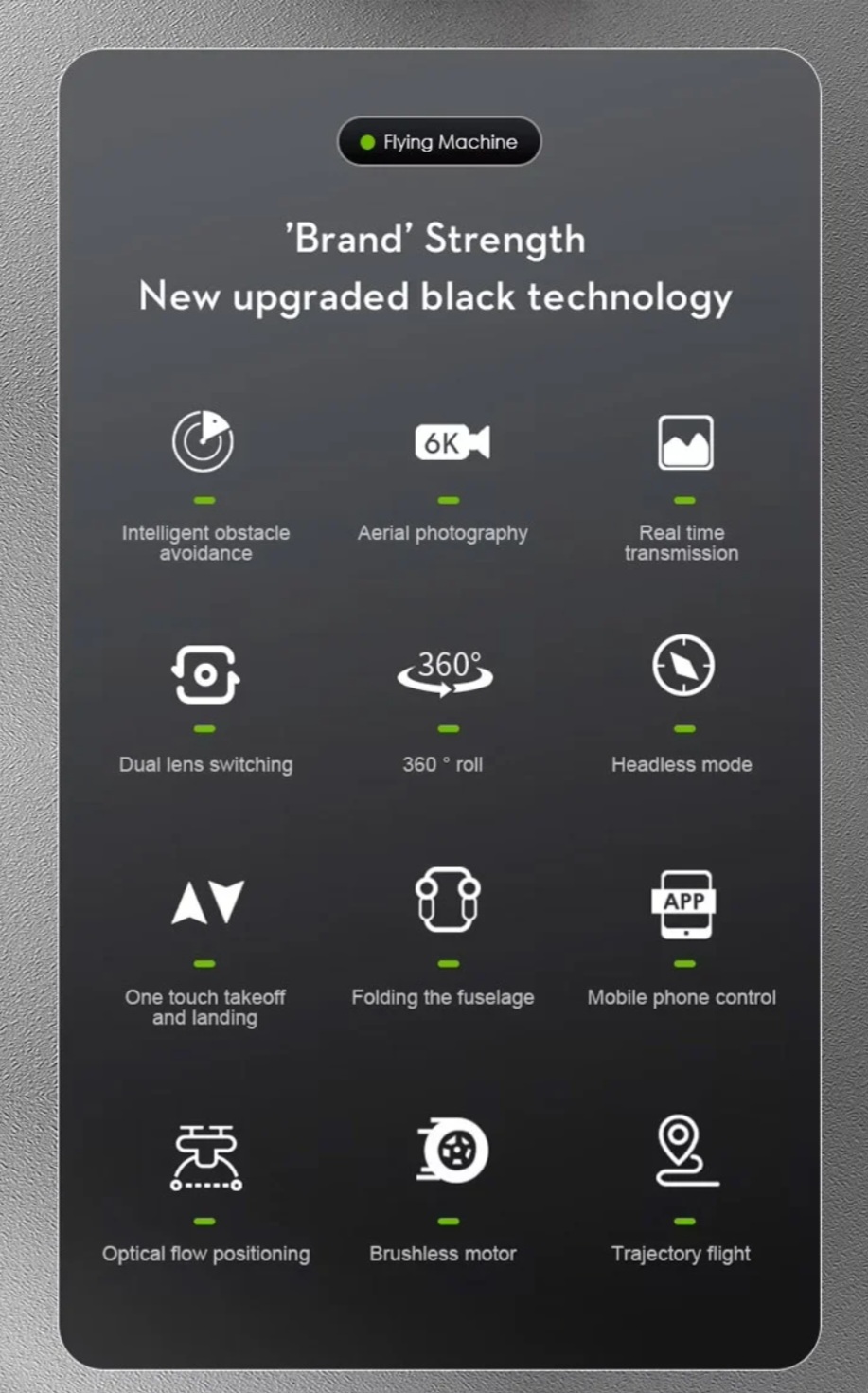 سنسور ویژن ، چرخش دور سوژه ، تعقیب سوژه ، عکس و فیلم گرفتن با نشان دادن دست ، پرواز آسان در شب بخاطر LED های پر نور ، هشدار خارج شدن از برد ، هشدار اتمام باتری ، مسیر دهی ، تنظیم سرعت ، زوم 50x ، تغییر زاویه دوربین با رادیو کنترل