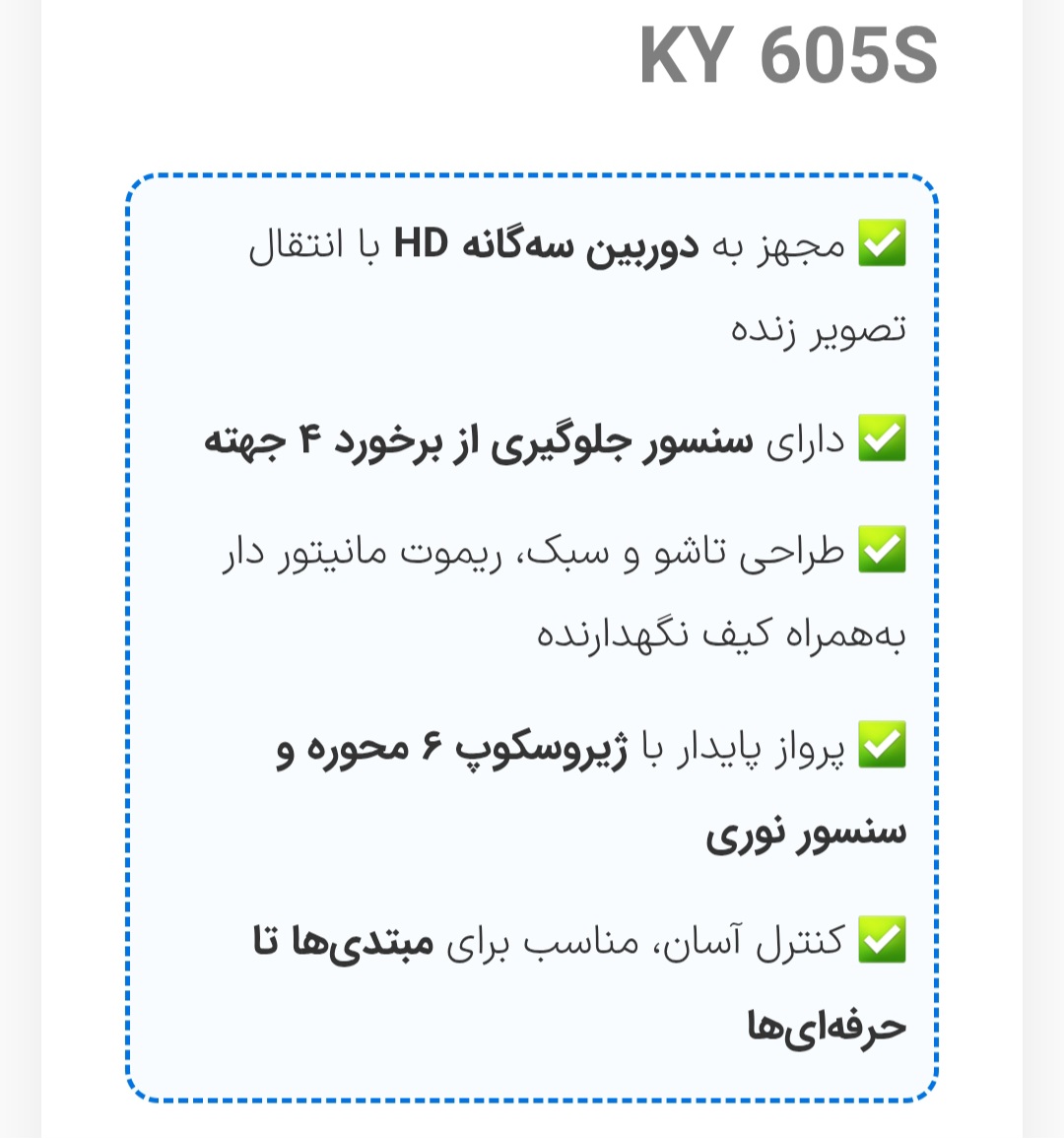کوادکوپتر KY605S انتخاب فوقالعادهای است. این پهپاد با دوربین باکیفیت،سنسورهای جلوگیری از برخورد، سیستم بازگشت به خانه و امکانات پرواز هوشمند، تجربهای لذتبخش و ایمن را به شما هدیه میدهد.