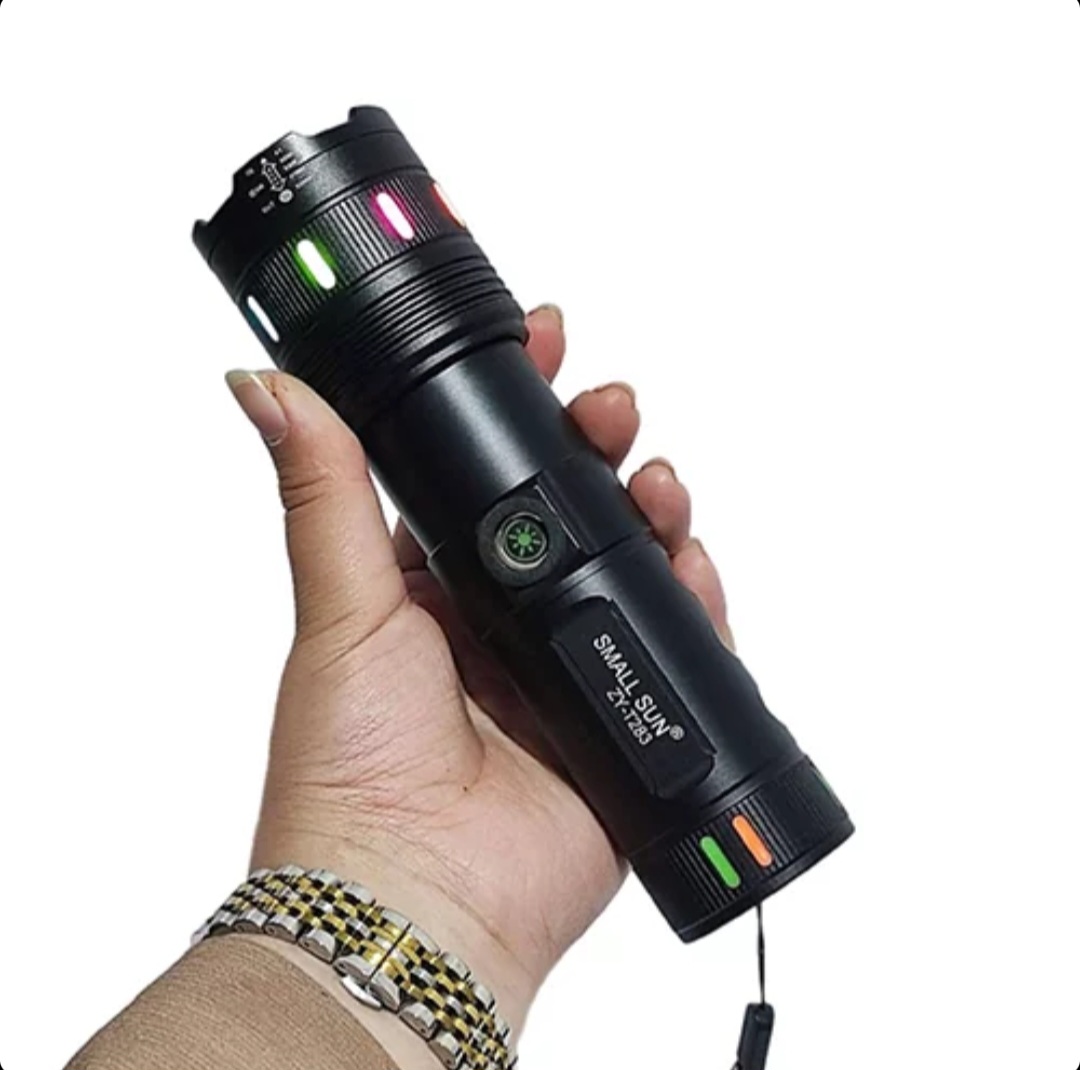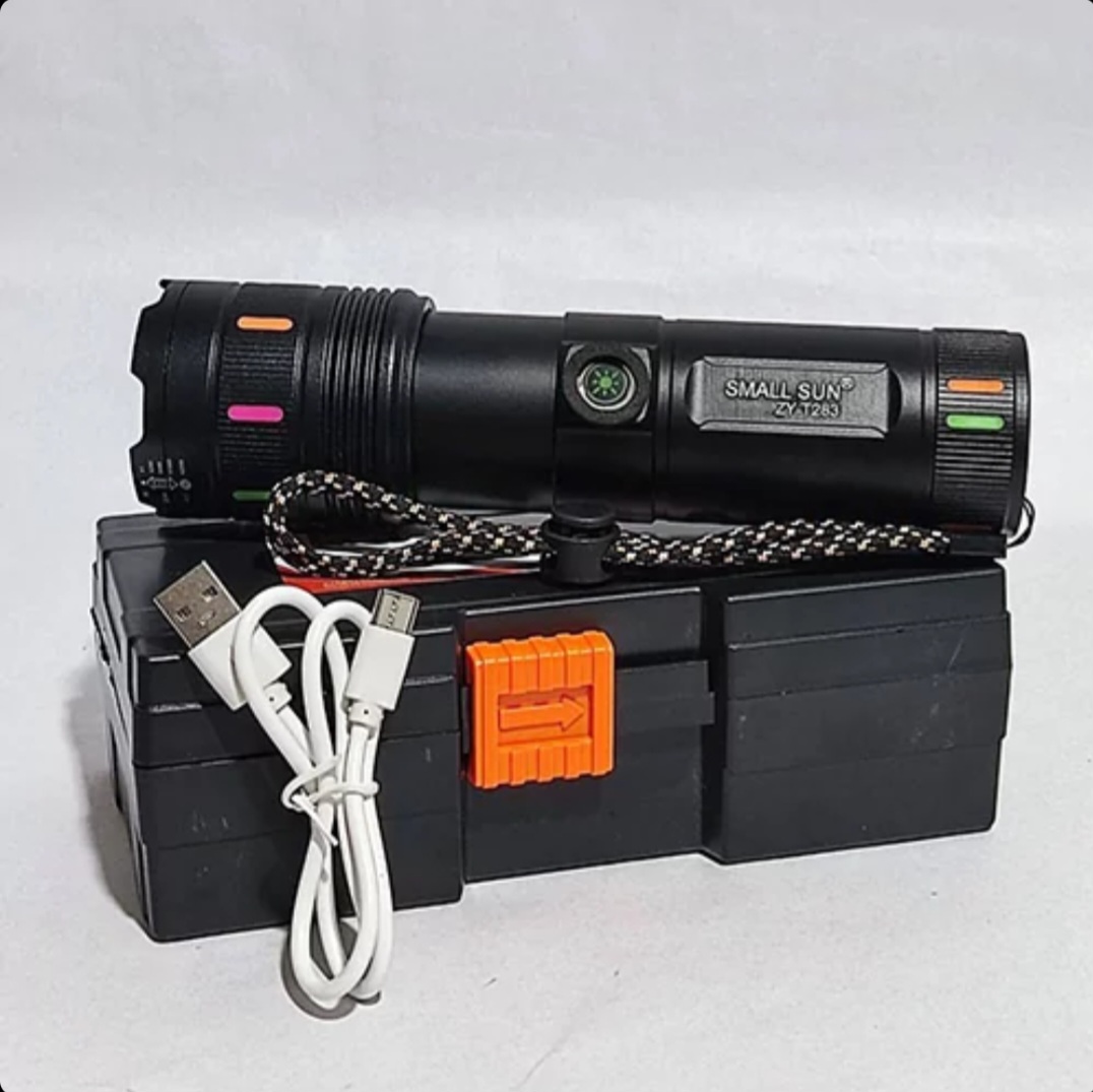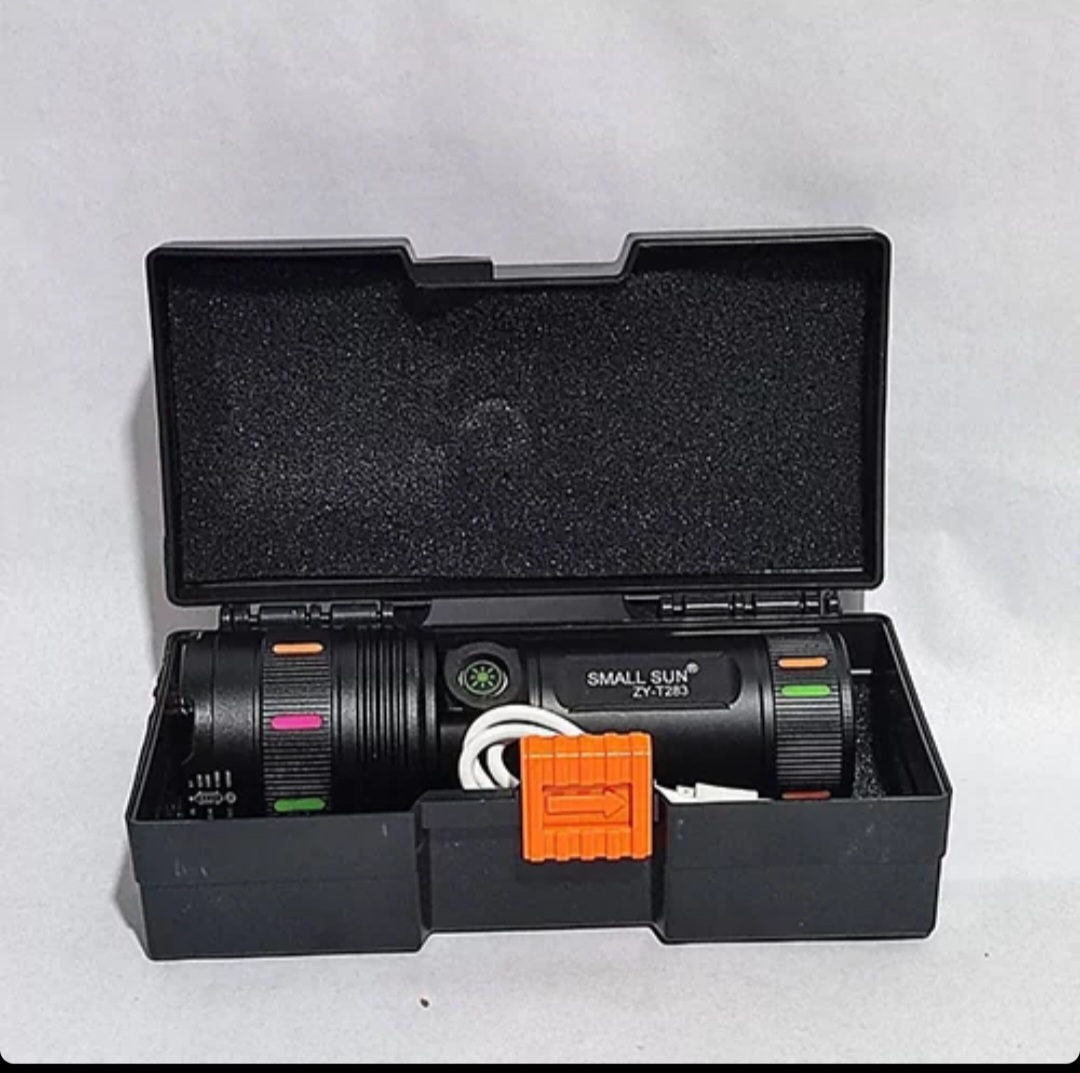 چراغ قوه اسمال سان مدل ZY-T283 برد نوری: تا 800 متر و بیشتر قدرت روشنایی: 1100 لومن برند و مدل: اسمال سان مدل ZY-T283 نوع باتری: 18650 شارژی با ظرفیت 3500 میلیآمپر قابلیت زوم: سیستم زوم دستی قابل تنظیم
